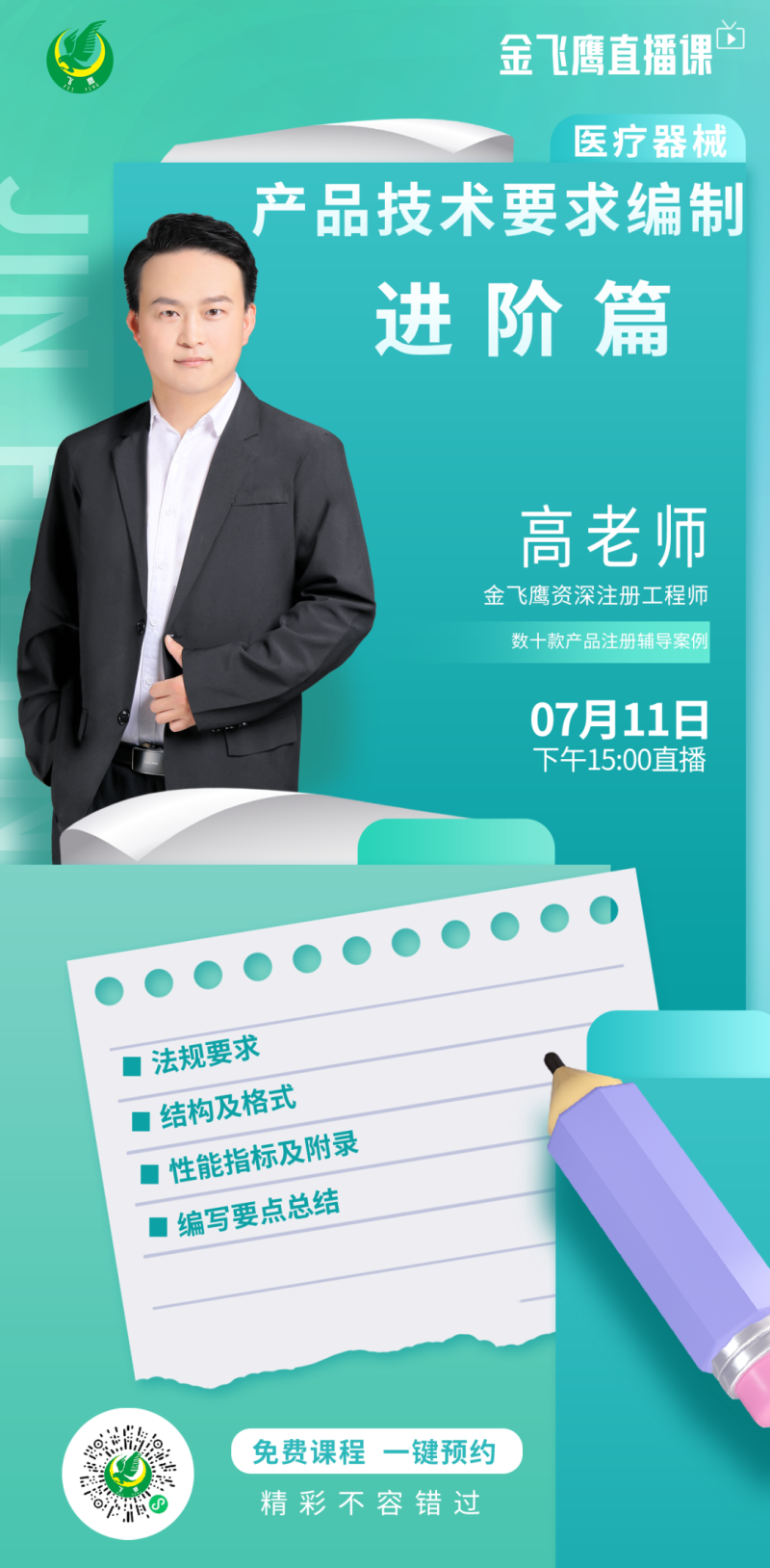 7月11日下午3點,金飛鷹資深注冊工程師,擁有多年醫療器械行業經驗,成功輔導數十款產品合規上市的高老師,給大家帶來《醫療器械產品技術要求編制-進階篇》,培訓內容包括法規要求、結構及格式、性能指標及附錄、編寫要點總結,大家千萬不要錯過了哦!