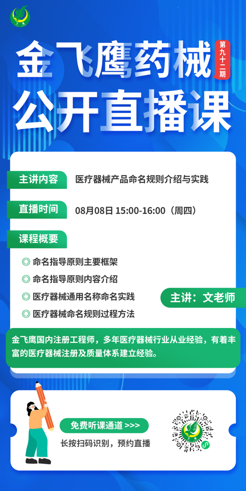 8月8日下午3點,金飛鷹國內注冊工程師,有著豐富的醫療器械注冊及質量體系建立經驗的文老師,給大家帶來《醫療器械注冊入門知識分享-產品命名規則介紹與實踐》,培訓內容包括命名指導原則主要框架、命名指導原則內容介紹、醫療器械通用名稱命名實踐、醫療器械命名規則過程方法,大家千萬不要錯過了!
