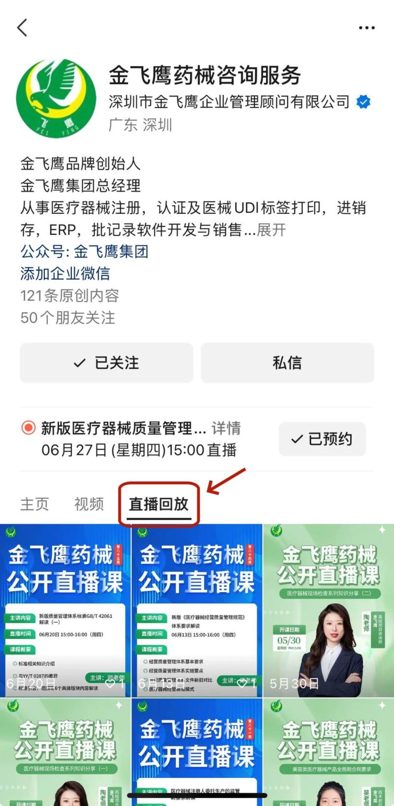 往期直播培訓(xùn)課程支持回放,關(guān)注“金飛鷹藥械咨詢服務(wù)”視頻號并點(diǎn)擊視頻號主頁,即可查看“直播回放”哦~