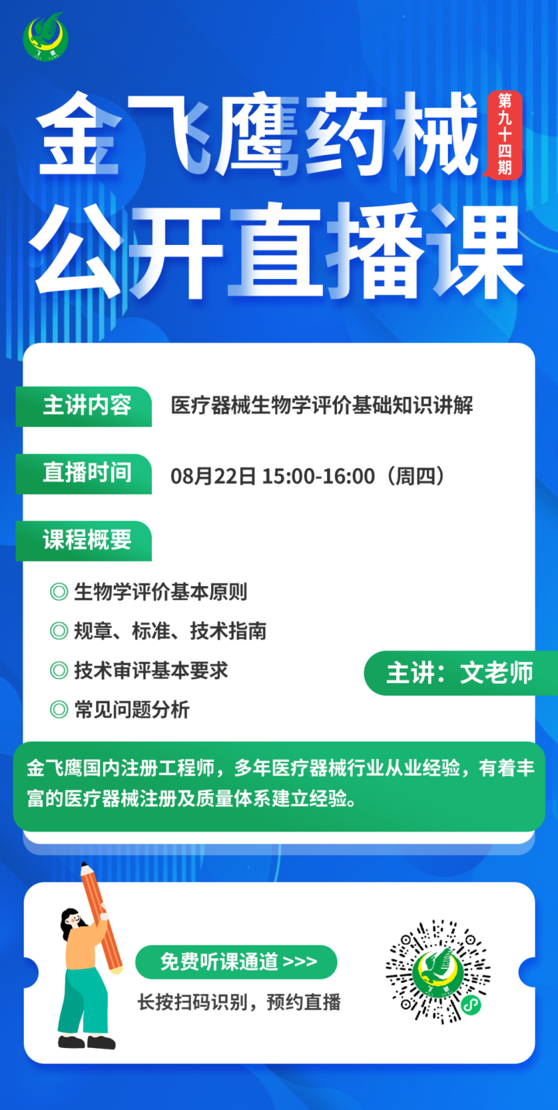 金飛鷹直播培訓(xùn),是每周一次的固定培訓(xùn)欄目,優(yōu)選金飛鷹國內(nèi)外資深注冊/項目老師定期為大家講解醫(yī)療器械注冊相關(guān)知識,解答大家在醫(yī)療器械注冊過程中的諸多疑問。