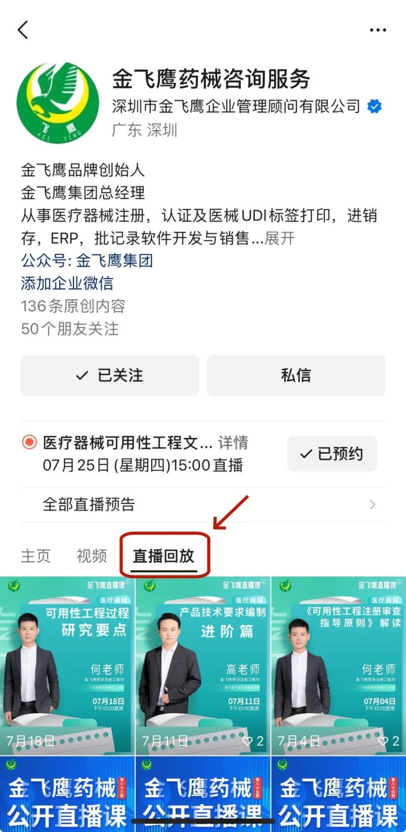 往期直播培訓(xùn)課程支持回放,關(guān)注“金飛鷹藥械咨詢服務(wù)”視頻號并點(diǎn)擊視頻號主頁,即可查看“直播回放”哦~