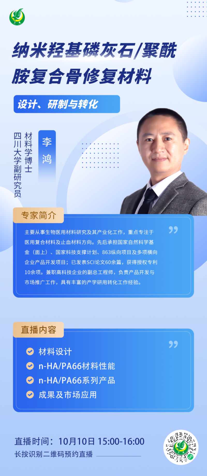 10月10日下午3點,李老師給大家帶來《納米羥基磷灰石/聚酰胺復合骨修復材料的設計、研制與轉化》,將從材料設計、材料性能、研究成果及市場應用等方面給大家詳細介紹,對此類高分子材料感興趣的朋友千萬不要錯過了哦~