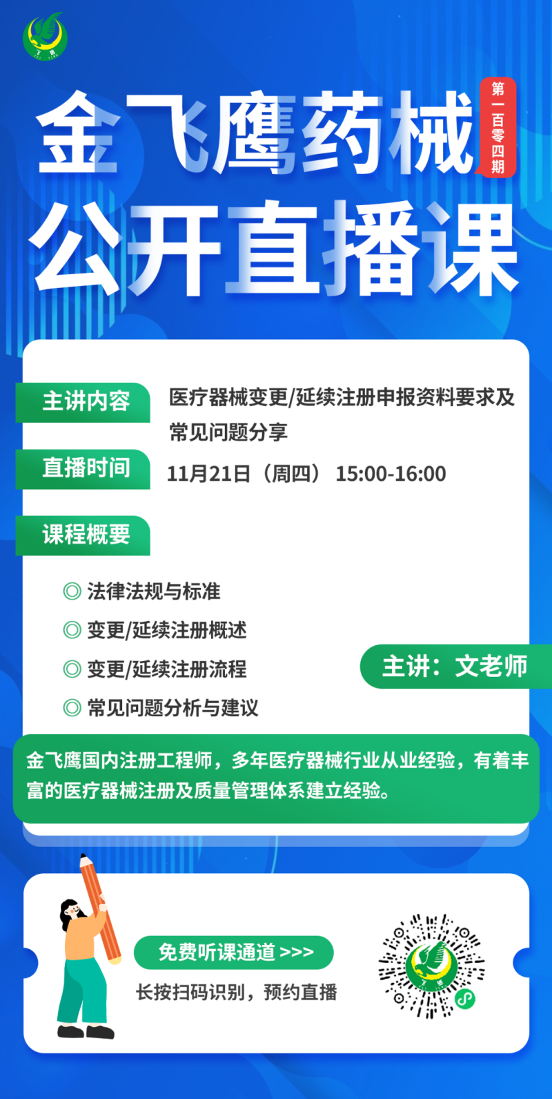 金飛鷹直播培訓,是每周一次的固定培訓欄目,優選金飛鷹國內外資深注冊/項目老師定期為大家講解醫療器械注冊相關知識,解答大家在醫療器械注冊過程中的諸多疑問。