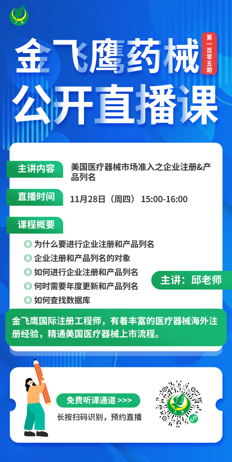 11月28日下午3點,金飛鷹國際注冊工程師,有著豐富的醫療器械海外注冊經驗,精通美國醫療器械上市流程的邱老師給大家帶來《美國醫療器械市場準入之企業注冊&產品列名,培訓內容包括企業注冊和產品列名的對象及操作方法、何時需要年度更新和產品列名、如何查找數據庫想聽課的朋友記得提前預約哦!