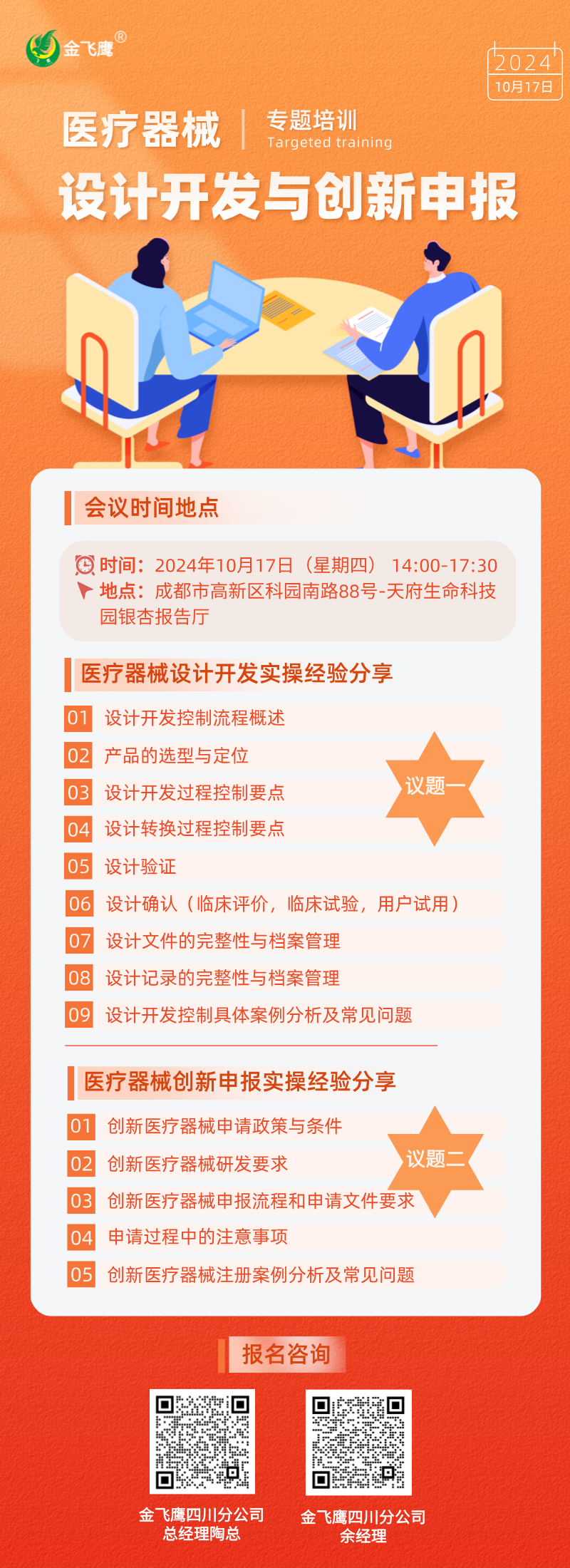 作為一家深耕醫療器械行業17年的專業咨詢公司,我們聯合成都高投生物醫藥園區管理有限公司,擬定于2024年10月17日14:00在成都天府生命科技園舉辦《醫療器械設計開發與創新申報專題培訓》,本期培訓由金飛鷹集團創始人、資深藥械認證技術專家車號爽老師主導,金飛鷹技術部經理吳偉宏老師輔助,借助我們服務3000+客戶的輔導經驗,根據產品、公司、人員情況,為您量身定制合規、高效、實用的設計開發管理!誠邀各地醫械企業報名參加!