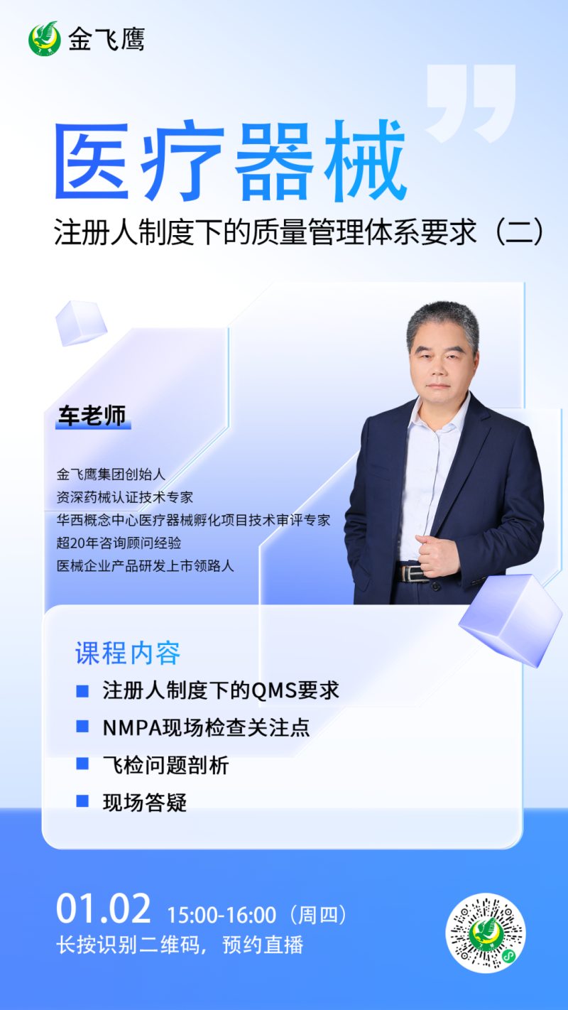 老規矩,最后再給大家劃個重點:1月2日下午3點,金飛鷹集團創始人車號爽老師給大家帶來《醫療器械注冊人制度下的質量管理體系要求》第二部分,繼續分享注冊人制度下的QMS要求以及NMPA現場檢查關注點、飛檢問題剖析,還有不容錯過的線上答疑,解答大家在實際操作過程中遇到的各種“疑難雜癥”,感興趣的朋友一定記得提前預約!