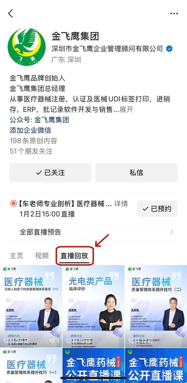往期直播培訓課程支持回放,關注“金飛鷹藥械咨詢服務”視頻號并點擊視頻號主頁,即可查看“直播回放”哦~