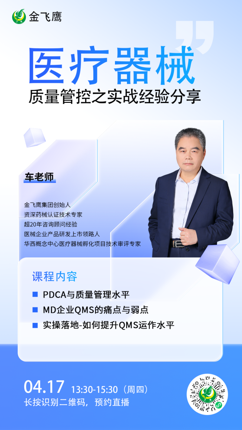 在此背景下,由金飛鷹、成都聯東U谷聯合主辦,成都高新區醫療器械創新轉化協會、動脈網、成都數智醫療創新聯盟協會協辦的醫療器械質量管理與注冊申報實操經驗分享的線下培訓,將于4月17日下午在成都溫江區聯東U谷·成都醫學城科技企業港30棟黨建活動中心舉辦。本次培訓聚焦“醫療器械質量工作日常管理技巧實操經驗專題”和“醫療器械注冊申報技巧實操經驗專題”兩大熱門主題,由金飛鷹集團創始人車號爽老師主導進行分享,他將結合金飛鷹輔導過的眾多成功案例,深入剖析醫療器械質量工作日常管理的實用技巧,為企業提供可落地的專業指導,提升企業的市場競爭力!