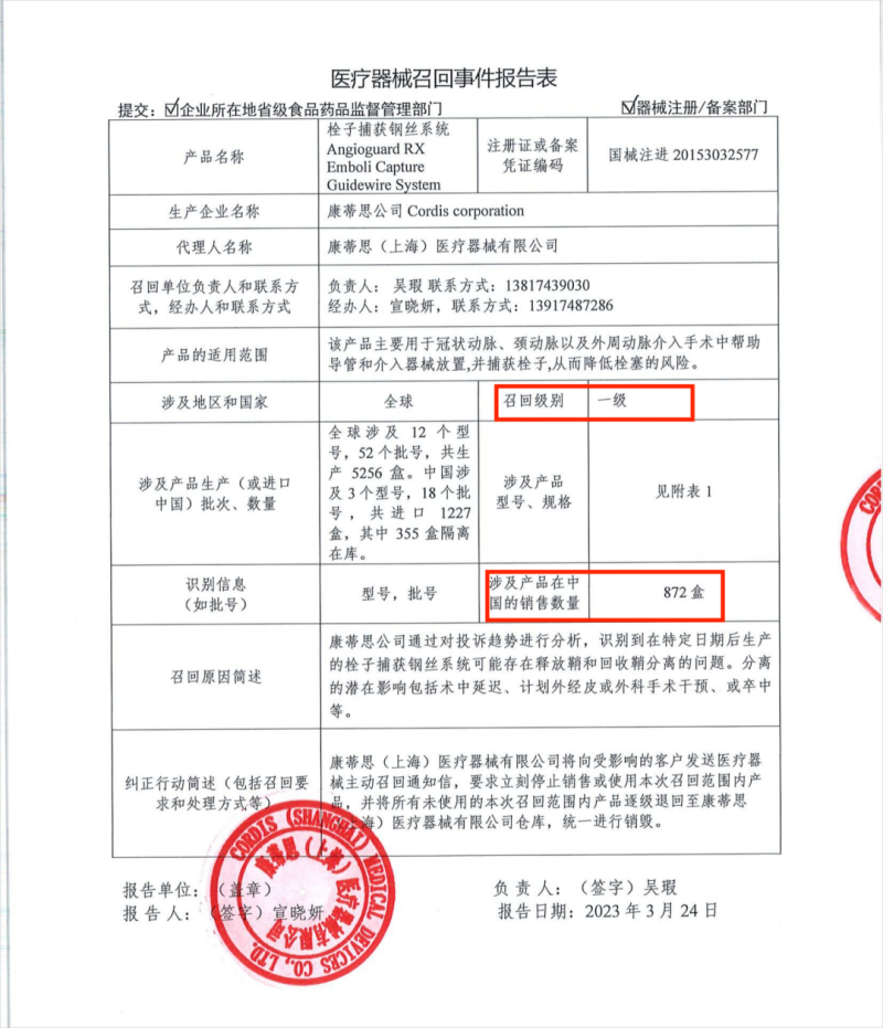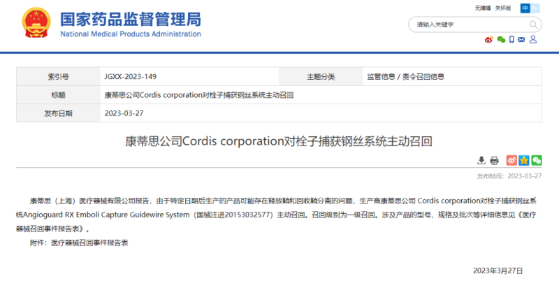 3月27日,國家藥監局官網發布一則醫療器械召回公告,由于特定日期后生產的產品可能存在釋放鞘和回收鞘分離的問題,生產商康蒂思公司 Cordis corporation對栓子捕獲鋼絲系統Angioguard RX Emboli Capture Guidewire System(國械注進20153032577)主動召回。召回級別為一級召回,詳情如下: