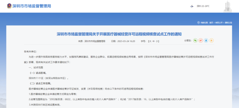 3月24日,深圳市市場監督管理局發布《關于開展醫療器械經營許可遠程視頻核查試點工作的通知》,具體內容如下: