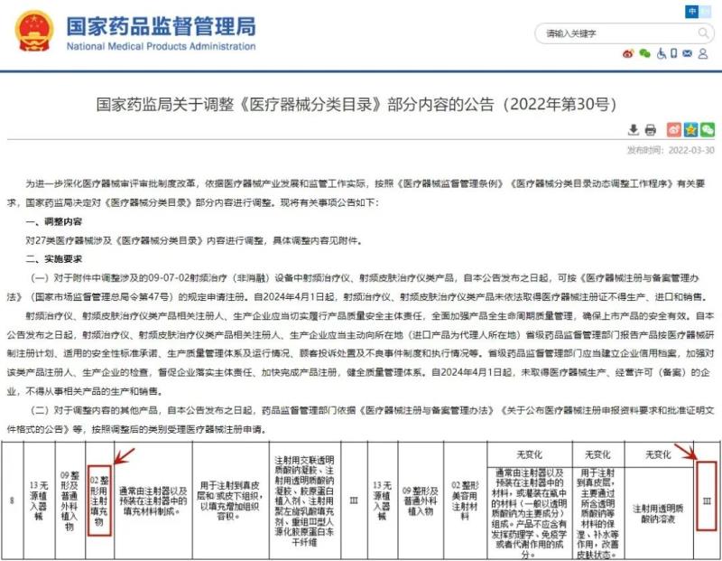 事實上,我們之前也跟大家科普過,國家藥監局早在2022年3月就發布了《關于調整〈醫療器械分類目錄〉部分內容的公告(2022年第30號)》,其中明確提到整形用注射填充物為監管級別最高的第三類醫療器械,需嚴格按照《醫療器械注冊與備案管理辦法》等進行醫療器械注冊申請。