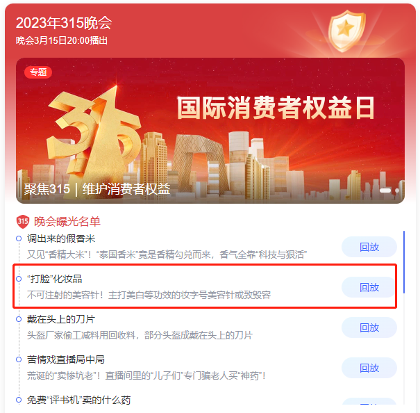 相信大家已有所了解,本年度315晚會被曝光的名單有假香米、美容針、安全頭盔……這其中有一個我們十分熟悉的產品——美容針。