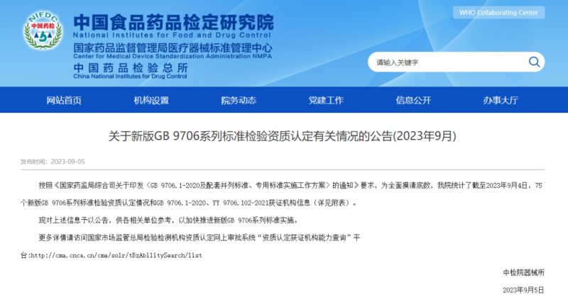 9月5日,中檢院官網公布了截至2023年9月4日,75個新版GB 9706系列標準檢驗資質認定情況和GB 9706.1-2020、YY 9706.102-2021獲證機構信息。我們從附件表格中可以看到,全國共有92家GB 9706.1-2020資質認定獲證機構,也就是說,可以承擔新標的安規檢測工作,具體如下: