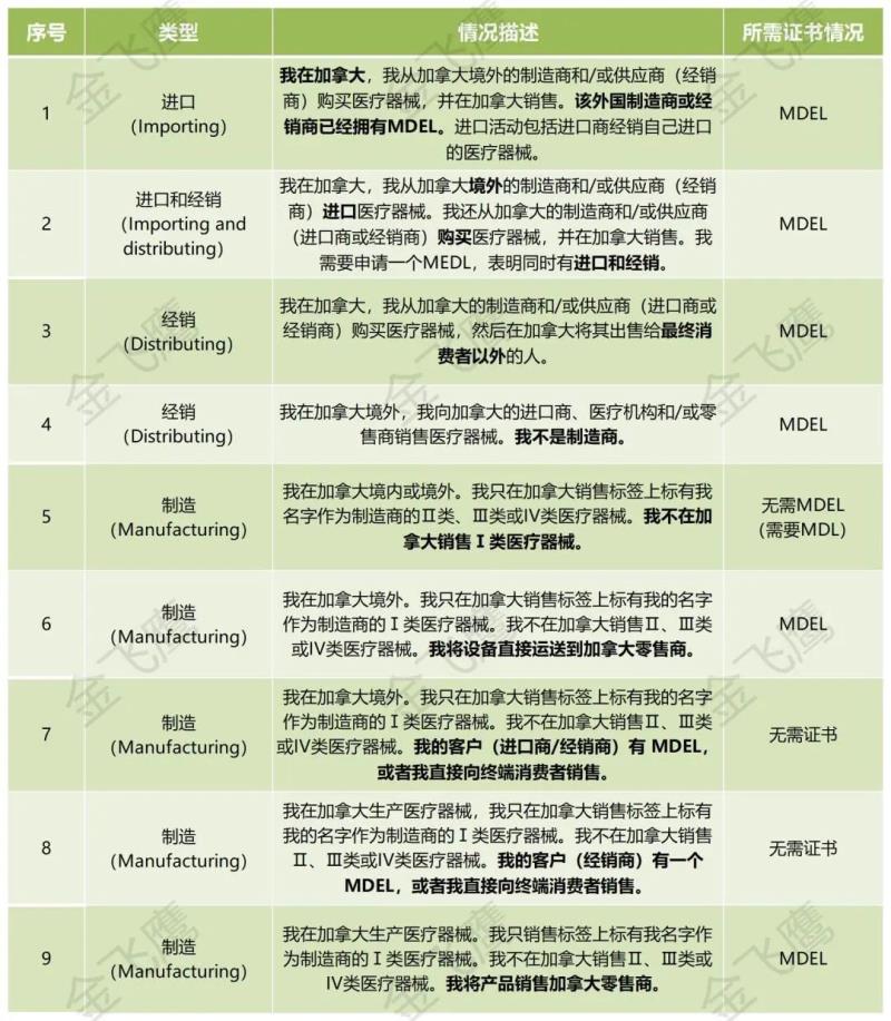 對比2020年版指南文件[ Guidance on Medical Device Establishment Licensing (GUI-0016) version 8(April 1, 2020)],要求持有MDEL的情形(指南文件表1)稍有變動,我們將最新表格翻譯轉載如下: