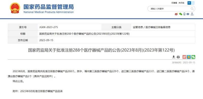 據國家藥監局官網近日發布,2023年8月,國家藥監局共批準注冊醫療器械產品288個。其中,境內第三類醫療器械產品229個,進口第三類醫療器械產品33個,進口第二類醫療器械產品24個,港澳臺醫療器械產品2個。