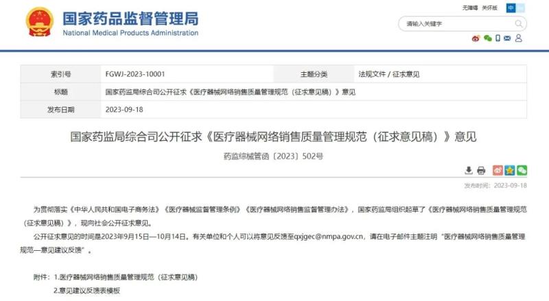 9月18日,國家藥監局官網發布《醫療器械網絡銷售質量管理規范(征求意見稿)》(以下簡稱《管理規范》),并向社會公開征求意見。