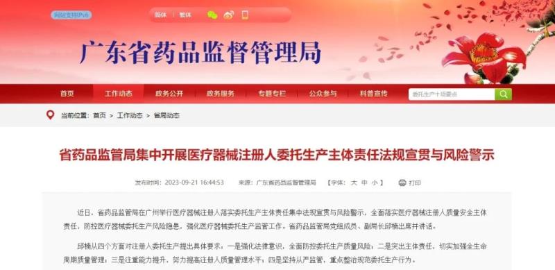 9月21日,廣東藥監局官網發布動態稱,近日,該局在廣州舉行醫療器械注冊人落實委托生產主體責任集中法規宣貫與風險警示,全面落實醫療器械注冊人質量安全主體責任,防控醫療器械委托生產風險隱患,強化醫療器械委托生產監管工作。