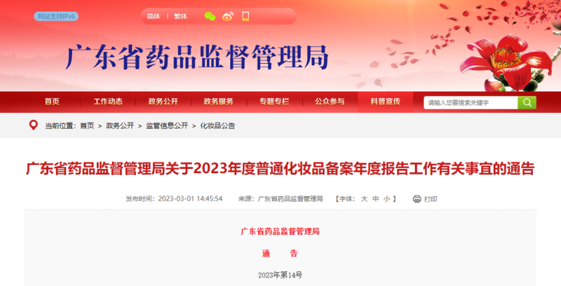 3月1日,廣東省藥監局官網發布《關于2023年度普通化妝品備案年度報告工作有關事宜的通告》,其中指出,自2022年1月1日起,普通化妝品備案人應當于每年1月1日至3月31日期間,通過新注冊備案平臺,提交備案時間滿一年普通化妝品的年度報告。2023年度備案年度報告工作已于2023年1月1日開始,將于2023年3月31日結束。2021年12月31日前備案的產品應當開展2023年度備案年度報告工作。