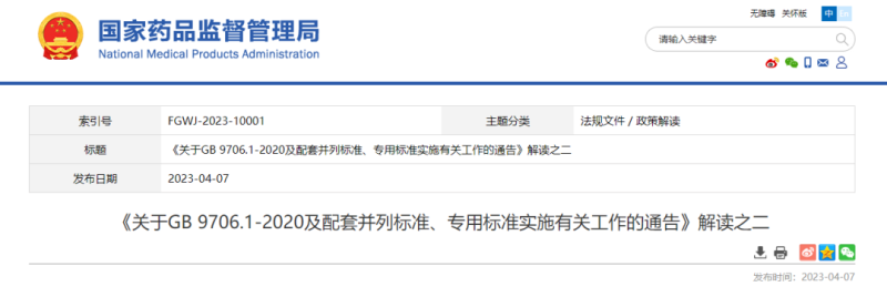 近日,國家藥監局官網發布《關于GB 9706.1-2020及配套并列標準、專用標準實施有關工作的通告》解讀,進一步明確了新版GB 9706系列標準實施工作相關事項,具體內容如下:
