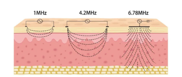 頻率決定射頻電流的作用深度,比如1MHz大約能作用到表皮層,2MHz能作用到表皮下層,3MHz則能作用到真皮乳突層,而4MHz可以作用到真皮網狀層,比如“熱瑪吉”一般是4MHz+的頻率。