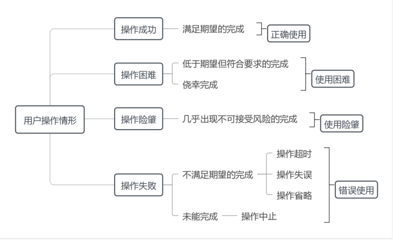 使用錯誤是指可能導(dǎo)致錯誤使用的潛在根源,可分為感知錯誤、認知錯誤和行動錯誤。其中,感知錯誤是指用戶對視覺、聽覺、觸覺等信息感知失效所致的使用錯誤,如看錯輸出結(jié)果單位、未聽到報警聲音等;認知錯誤是指用戶對知識、規(guī)則、信息存在記憶、理解等認知失效所致的使用錯誤,如漏記手術(shù)操作步驟、誤解符號含義等;行動錯誤是指用戶操作失誤、不當(dāng)?shù)刃袆邮碌氖褂缅e誤,如按錯控制按鈕、按壓力度不夠而未激活等。