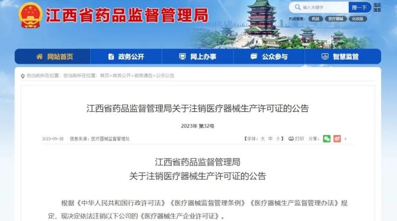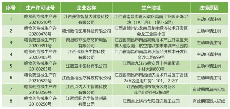 近日,江西省藥監局發布公告稱,注銷江西美德智慧大健康科技有限公司等8家公司的醫療器械生產許可證,以下為具體明細: