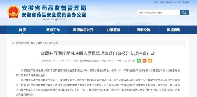 本期推送的頭條文章我們跟大家分享了質量管理體系自查報告應包含的主要內容,緊接上一篇內容,我們將安徽省藥監局近期對2022年度安徽省醫療器械注冊人自查報告的專項抽查情況進行轉載。