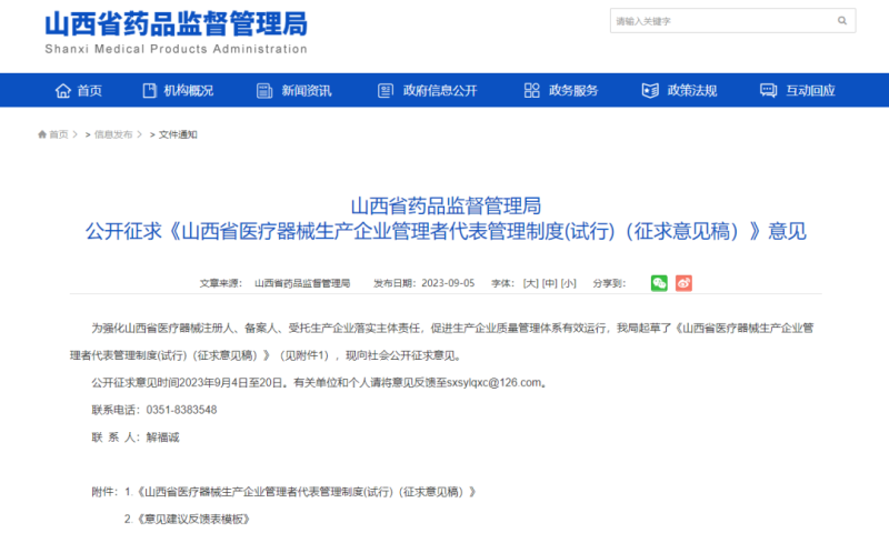 近日,山西省藥監局官網發布《山西省醫療器械生產企業管理者代表管理制度(試行)(征求意見稿)》(以下簡稱《征求意見稿》),并向社會公開征求意見。