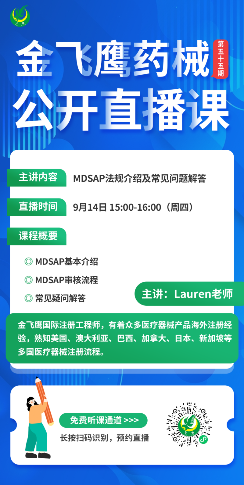 9月14日下午3點,金飛鷹國際注冊工程師,有著眾多醫療器械產品海外注冊經驗,熟知美國、澳大利亞、巴西、日本等多國注冊流程的Lauren老師,給大家帶來《MDSAP法規介紹及常見問題解答》,培訓內容包括MDSAP基本介紹、MDSAP審核流程以及常見問題解答等,大家千萬不要錯過了哦!