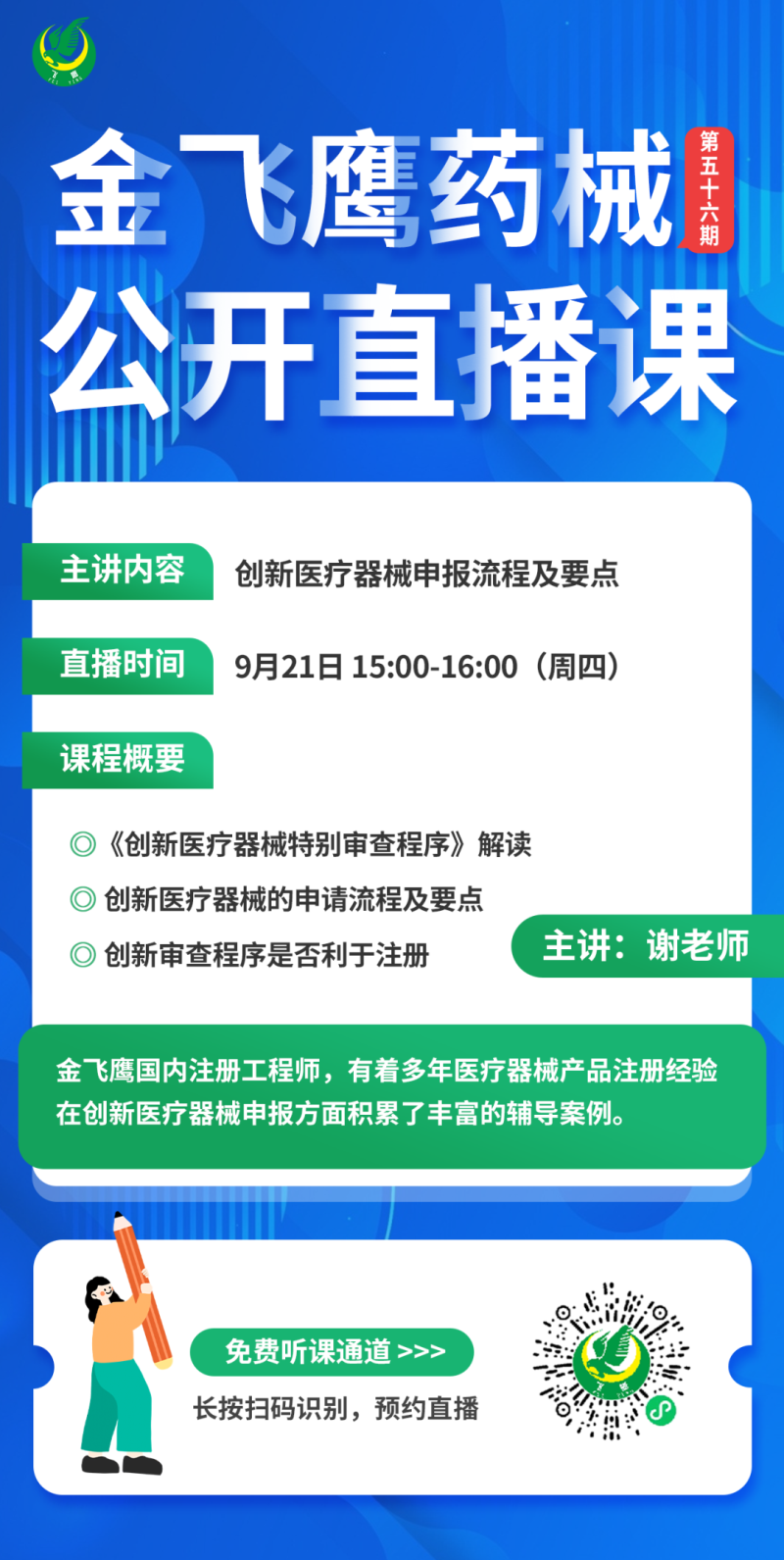 9月21日下午3點,金飛鷹國內注冊工程師,有著多年醫療器械產品注冊經驗,在創新療器械申報方面積累了豐富輔導案例的謝老師,給大家帶來《創新醫療器械申報流程及要點》,培訓內容包括《創新醫療器械特別審查程序》解讀、創新醫療器械的申請流程及要點、創新審查程序是否利于注冊等,大家千萬不要錯過了哦!
