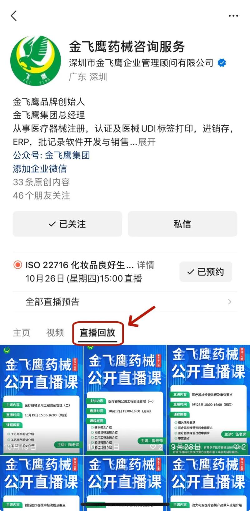 往期直播培訓(xùn)課程支持回放,關(guān)注“金飛鷹藥械咨詢服務(wù)”視頻號并點(diǎn)擊視頻號主頁,即可查看“直播回放”哦~