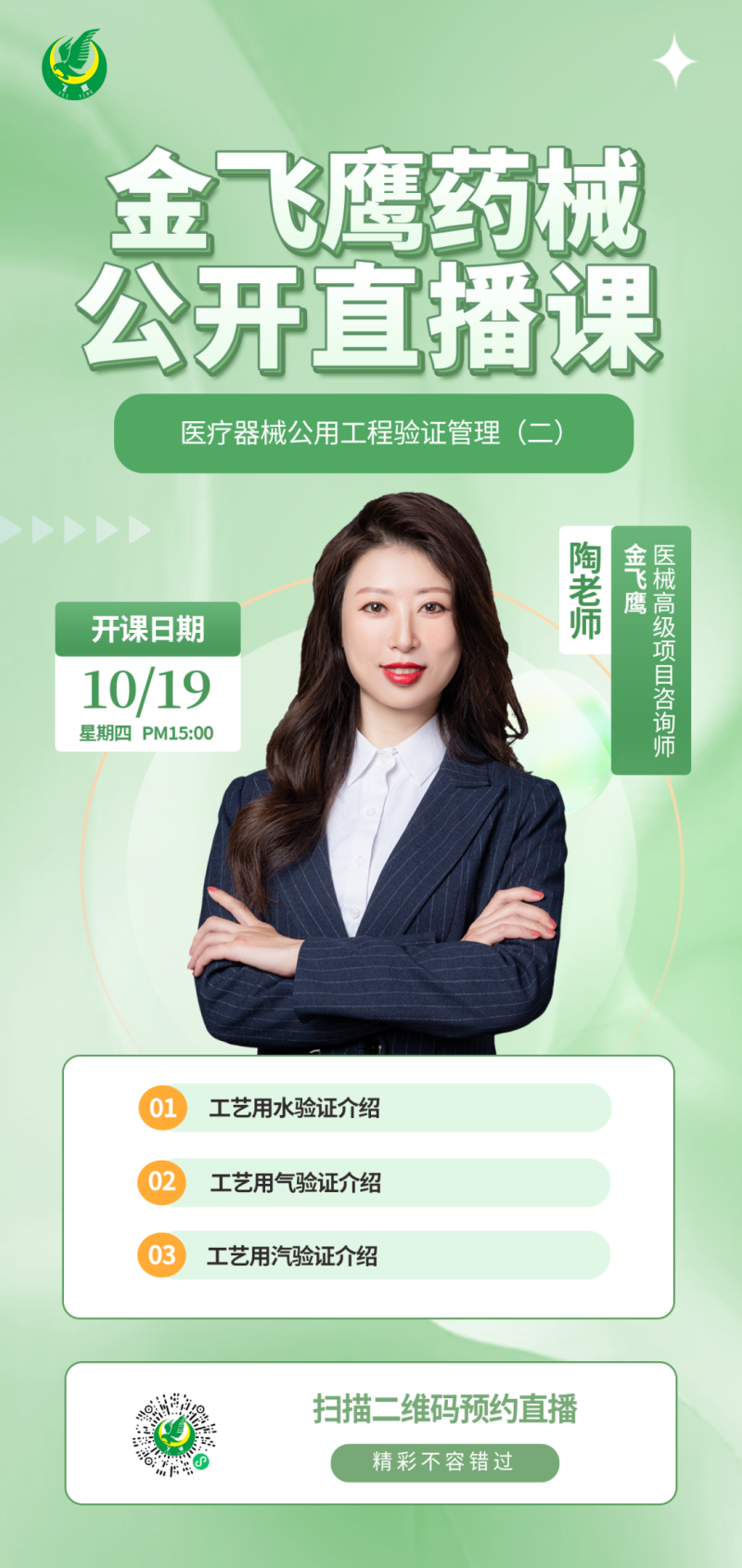 10月19日下午3點(diǎn),金飛鷹高級項(xiàng)目咨詢師,有著15年工廠管理、7年質(zhì)量經(jīng)理及廠長經(jīng)驗(yàn),曾主導(dǎo)多個(gè)Ⅱ類&Ⅲ類醫(yī)療器械廠房項(xiàng)目建設(shè)的陶老師,繼續(xù)給大家?guī)?/span>《醫(yī)療器械公用工程驗(yàn)證管理(二)》,培訓(xùn)內(nèi)容包括工藝用水驗(yàn)證介紹、工藝用氣驗(yàn)證介紹、工藝用汽驗(yàn)證介紹等,大家千萬不要錯(cuò)過了哦!