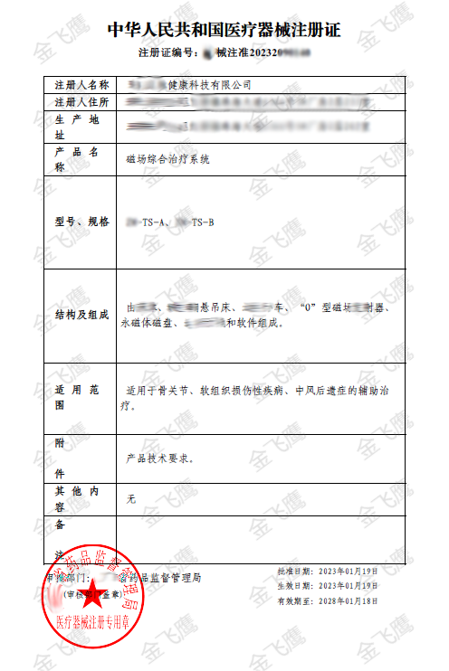 前些天我們跟大家分享了穴位磁療貼的成功案例,接上期內容,今天的主角依然是磁療,產(chǎn)品則是更為復雜的磁場綜合治療系統(tǒng)。前段時間,金飛鷹輔導一家企業(yè)成功取得了磁場綜合治療系統(tǒng)的注冊證,如下圖?