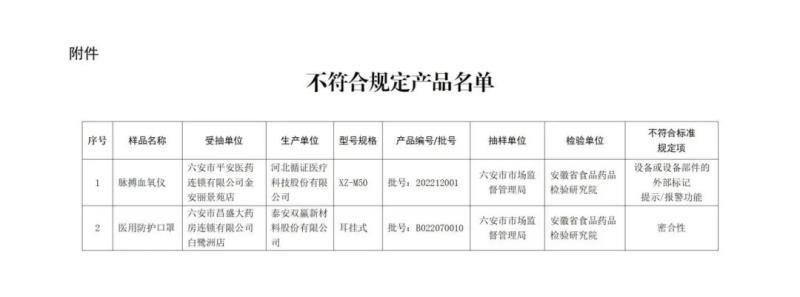 (一)脈搏血氧儀1批:標示為河北循證醫療科技股份有限公司生產,設備或設備部件的外部標記 提示/報警功能不符合標準規定。(二)醫用防護口罩1批:標示為泰安雙贏新材料股份有限公司生產,密合性不符合標準規定。