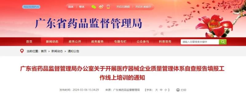 近日,廣東省藥監局發布《關于開展醫療器械企業質量管理體系自查報告填報工作線上培訓的通知,其中指出,凡2023年12月31日前登記注冊的醫療器械注冊人、備案人、受托生產企業、進口醫療器械代理人,都應當對質量管理體系運行情況進行自查,通過廣東省智慧藥監企業專屬網頁提交2023年度質量管理體系自查報告