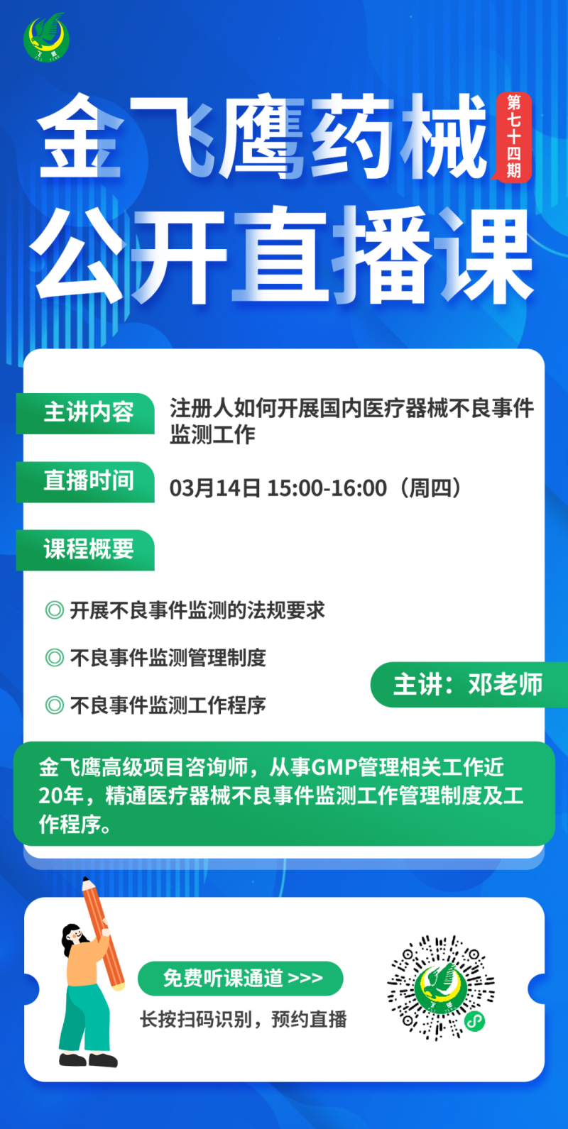 3月14日下午3點(diǎn),金飛鷹高級項(xiàng)目咨詢師,從事GMP管理相關(guān)工作近20年,精通醫(yī)療器械不良事件監(jiān)測工作管理制度及工作程序的鄧?yán)蠋煟?/span>給大家?guī)怼蹲匀巳绾伍_展國內(nèi)醫(yī)療器械不良事件監(jiān)測工作》,培訓(xùn)內(nèi)容包括醫(yī)療器械不良事件監(jiān)測管理制度、工作程序等,感興趣的企業(yè)千萬不要錯(cuò)過了哦!