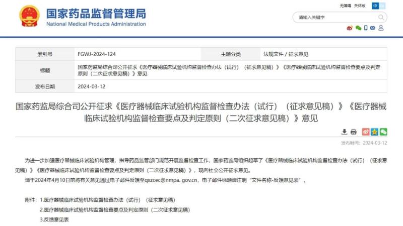 3月12日,國家藥監局發布《醫療器械臨床試驗機構監督檢查辦法(試行)(征求意見稿)》《醫療器械臨床試驗機構監督檢查要點及判定原則(二次征求意見稿)》,并向社會公開征求意見。