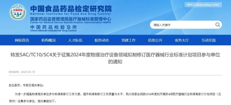 3月19日,國家藥監局醫療器械標管中心轉發了全國醫用電器標準化技術委員會物理治療設備分技術委員會《關于征集2024年度物理治療設備領域擬制修訂醫療器械行業標準計劃項目參與單位的通知》,2024年擬對紫外治療設備、減重步行訓練設備、平衡測試訓練系統、局部物理降溫用設備的行業標準進行制修訂,具體如下: