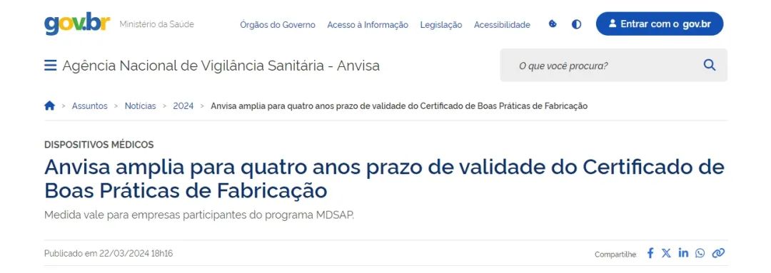 近日,Anvisa發布RDC 850/2024號決議,正式將通過MDSAP授予醫療器械制造商的BGMP證書有效期從兩年延長至四年。條件是制造商在整個證書有效期內都必須繼續參與MDSAP。