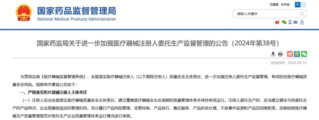 4月3日,國家藥監(jiān)局發(fā)布《關(guān)于進一步加強醫(yī)療器械注冊人委托生產(chǎn)監(jiān)督管理的公告(2024年第38號)》,具體內(nèi)容如下: