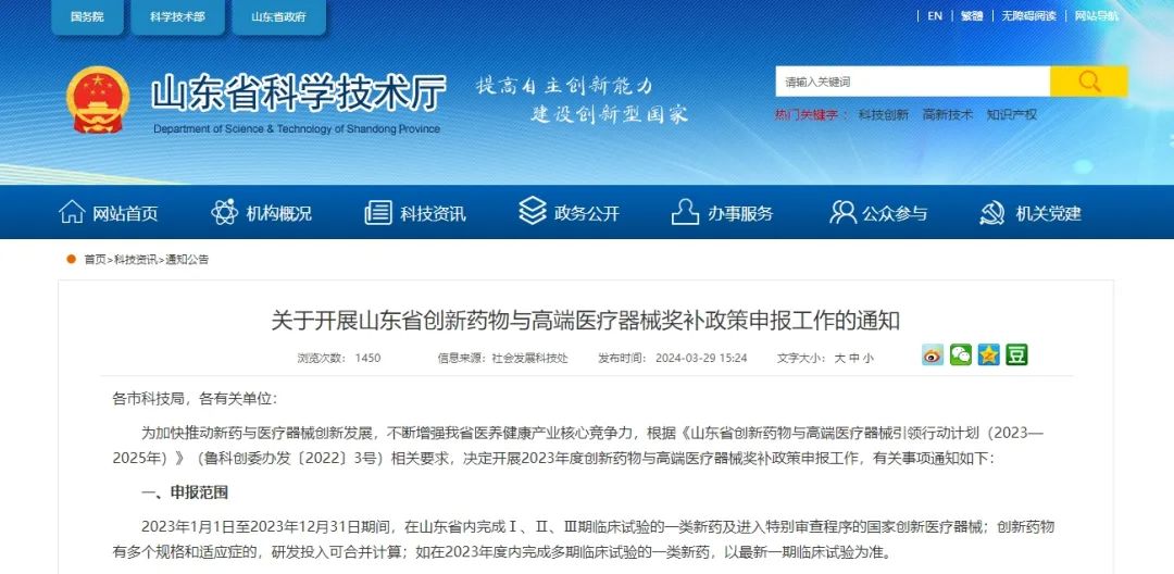 近日,山東省科學技術廳發布通知稱,根據《山東省創新藥物與高端醫療器械引領行動計劃(2023-2025年)》(魯科創委辦發〔2022〕3號)相關要求,決定開展2023年度創新藥物與高端醫療器械獎補政策申報工作,有關事項具體如下: