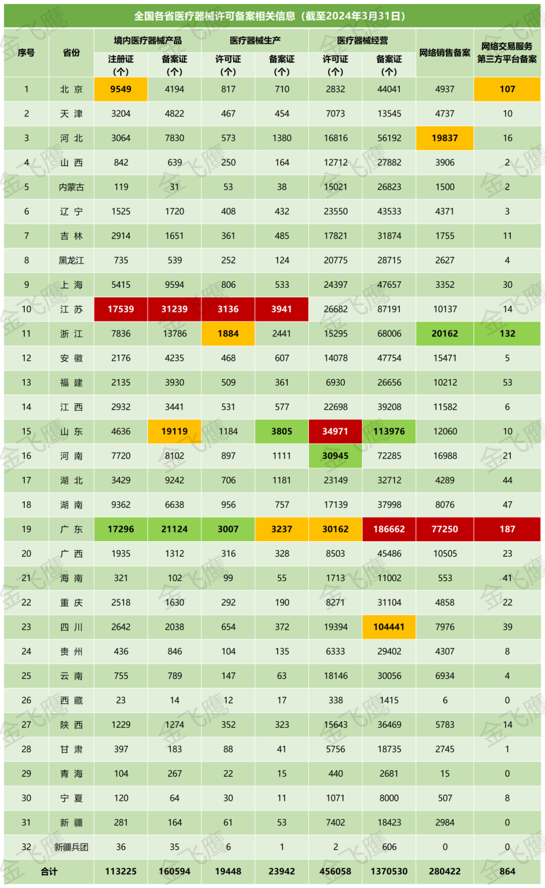 4月8日,國家藥監局公布了截至2024年3月31日各省有效期內醫療器械產品注冊備案、醫療器械生產企業許可備案等信息,老規矩,金飛鷹小編對此稍作編輯,標注紅色、綠色、黃色的分別為前三甲。
