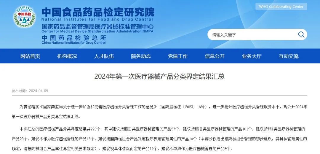 4月9日,國家藥監局醫療器械標準管理中心發布《2024年第一次醫療器械產品分類界定結果匯總》,本次共匯總了223個醫療器械產品分類界定結果,其中建議按照Ⅲ類醫療器械管理的產品57個,建議按照Ⅱ類醫療器械管理的產品101個,建議按照Ⅰ類醫療器械管理的產品23個,建議不作為醫療器械管理的產品16個,建議按照藥械組合產品判定程序界定管理屬性的產品10個,建議視具體情況而定的產品11個,建議不單獨作為醫療器械管理的產品5個。