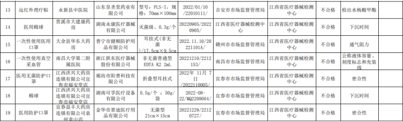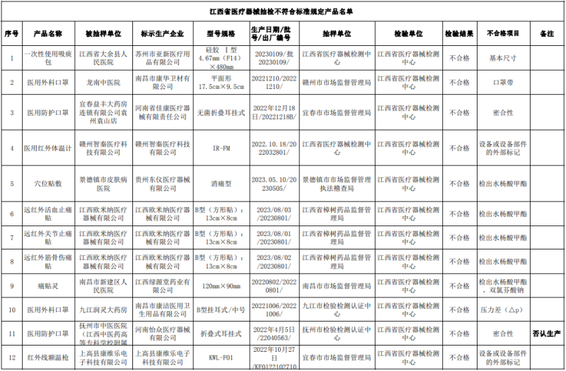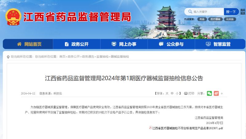 近日,江西藥監(jiān)局發(fā)布2024年第一季度醫(yī)療器械監(jiān)督抽檢信息通告,共有19批次產(chǎn)品抽檢不合格: