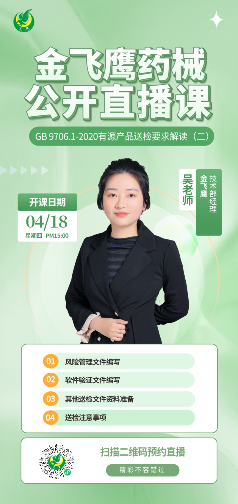 金飛鷹直播培訓(xùn),是每周一次的固定培訓(xùn)欄目,優(yōu)選金飛鷹國(guó)內(nèi)外資深注冊(cè)/項(xiàng)目老師定期為大家講解醫(yī)療器械注冊(cè)相關(guān)知識(shí),解答大家在醫(yī)療器械注冊(cè)過程中的諸多疑問。