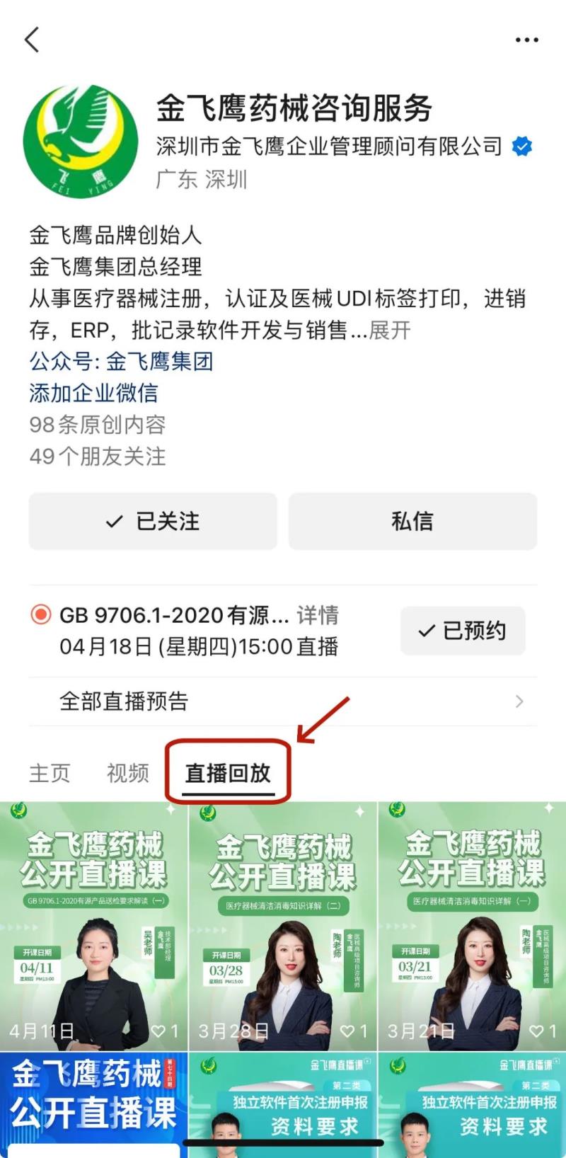 往期直播培訓(xùn)課程支持回放,關(guān)注“金飛鷹藥械咨詢服務(wù)”視頻號(hào)并點(diǎn)擊視頻號(hào)主頁,即可查看“直播回放”哦~