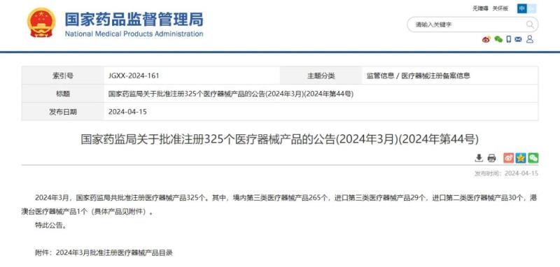 4月15日,國家藥監(jiān)局官網(wǎng)發(fā)布公告稱,2024年3月,國家藥監(jiān)局共批準(zhǔn)注冊醫(yī)療器械產(chǎn)品325個。其中,境內(nèi)第三類醫(yī)療器械產(chǎn)品265個,進(jìn)口第三類醫(yī)療器械產(chǎn)品29個,進(jìn)口第二類醫(yī)療器械產(chǎn)品30個,港澳臺醫(yī)療器械產(chǎn)品1個。