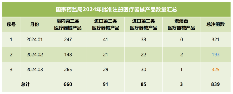 我們同步匯總了2024年第一季度國家藥監(jiān)局批準(zhǔn)注冊的醫(yī)療器械產(chǎn)品數(shù)量(見下方表格),從表格中可以看出,截至3月,2024年國家藥監(jiān)局總計(jì)批準(zhǔn)注冊醫(yī)療器械產(chǎn)品839個,其中境內(nèi)第三類醫(yī)療器械產(chǎn)品660個,進(jìn)口第三類醫(yī)療器械產(chǎn)品91個,進(jìn)口第二類醫(yī)療器械產(chǎn)品85個,港澳臺醫(yī)療器械產(chǎn)品3個。