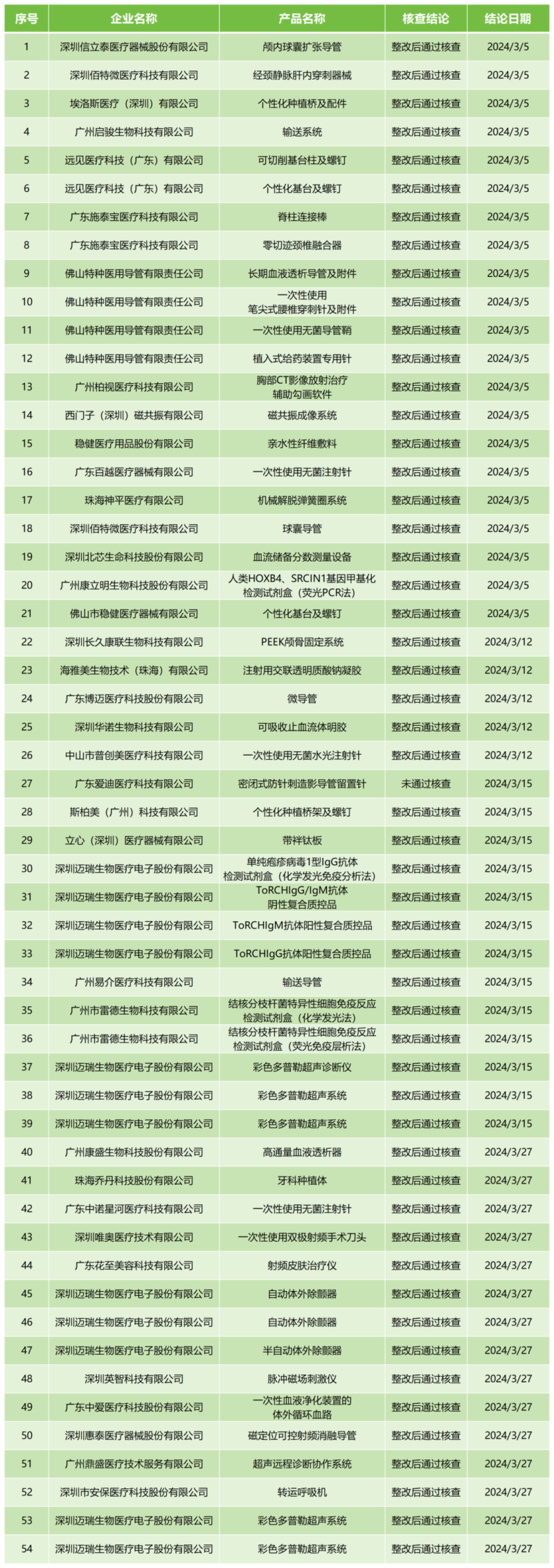 4月17日,廣東省藥監局官網公布2024年3月醫療器械注冊質量管理體系核查結果,包括深圳邁瑞生物醫療電子股份有限公司、遠見醫療科技(廣東)有限公司、穩健醫療用品股份有限公司、廣東花至美容科技有限公司在內的36家公司共計54款產品,其中53款產品為“整改后通過核查”,有一款產品“未通過核查”。具體明細見下方表格: