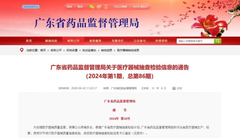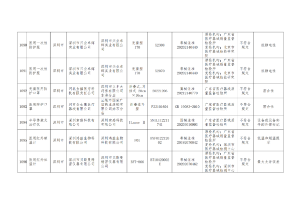 4月22日,廣東藥監局發布《關于醫療器械抽查檢驗信息的通告(2024年第1期,總第86期)》,我們通過查看通告中的附件發現,本次共抽查檢驗了1121批次產品,其中有37批次不符合規定,包括弱視綜合治療儀、半導體激光治療儀、注射泵、臂式電子血壓計等產品,不符合規定產品具體明細如下: